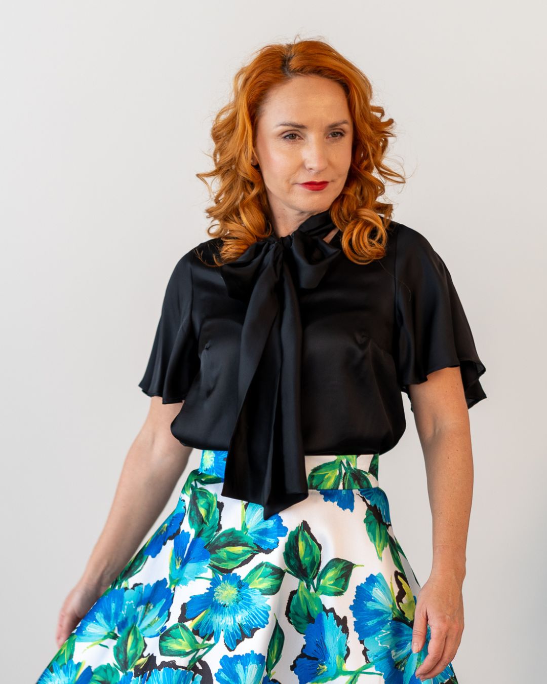 Vpredu je blúzka kratšia ako vzadu, takže sa dá nosiť aj voľne; a keďže je zo splývavého materiálu, tak pekne ukáže i zakasaná v páse našich sukní, či sukňovíc.