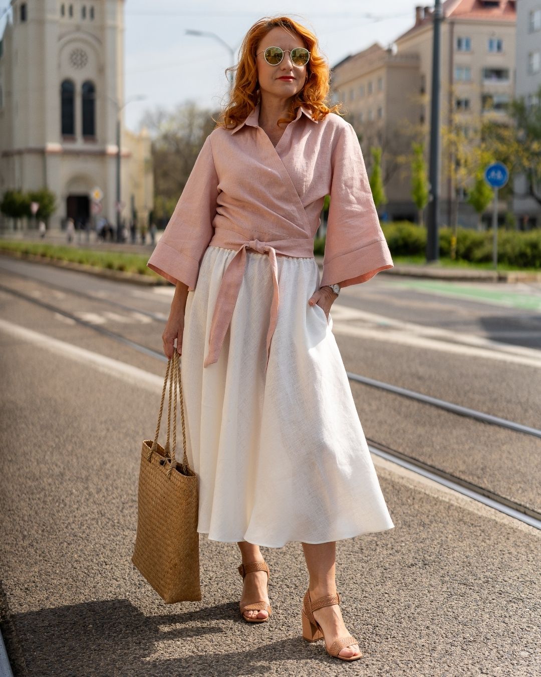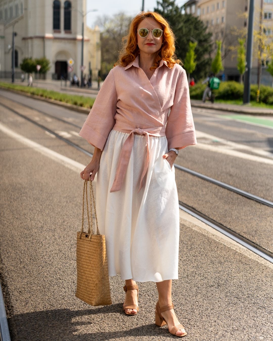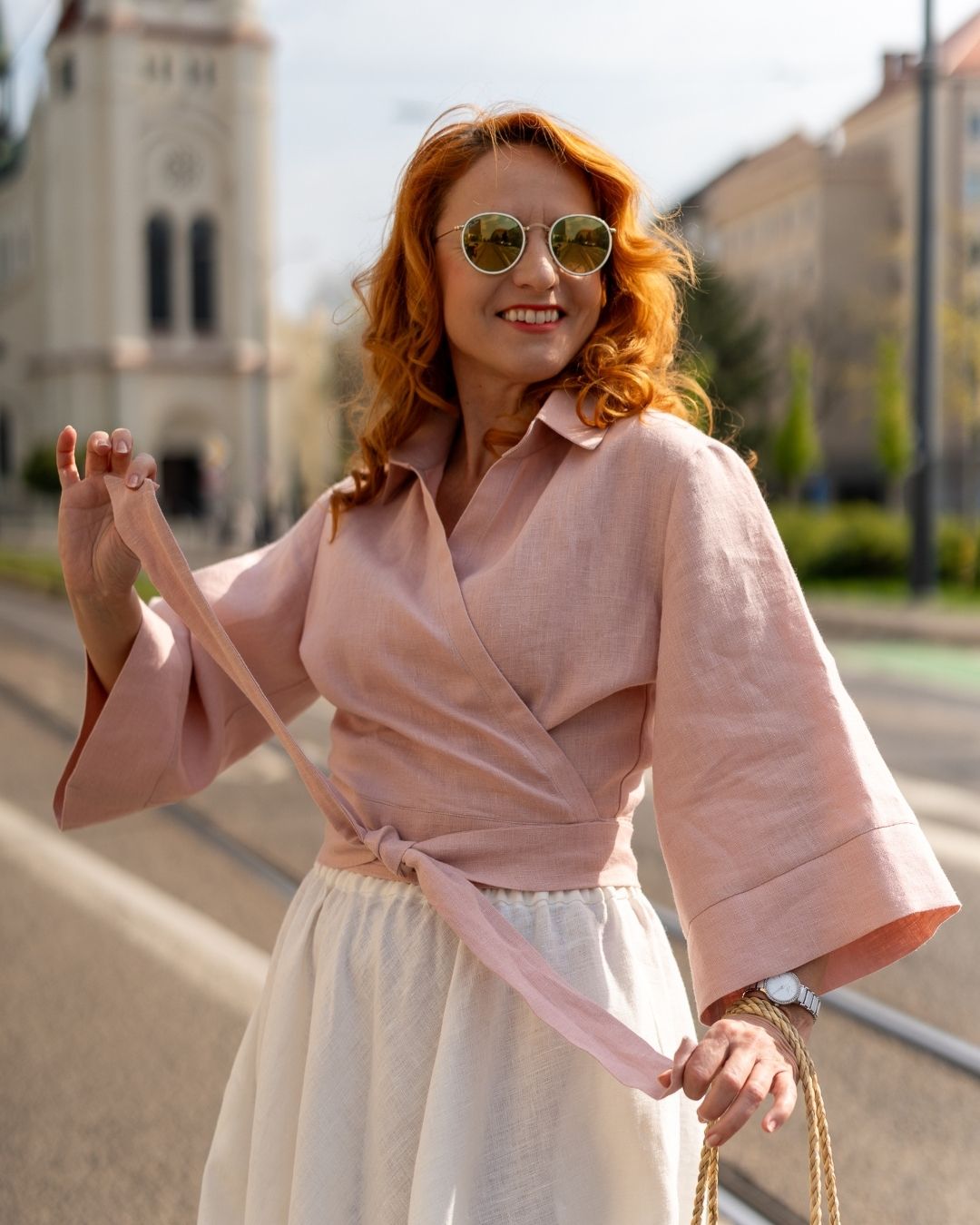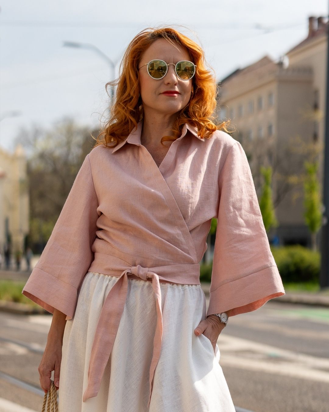 Ľanová košeľa zavinovacieho voľného strihu, vytvára vpredu zavinutím V výstrih a má košeľový golier. 3/4 rukávy sa rozširujú.